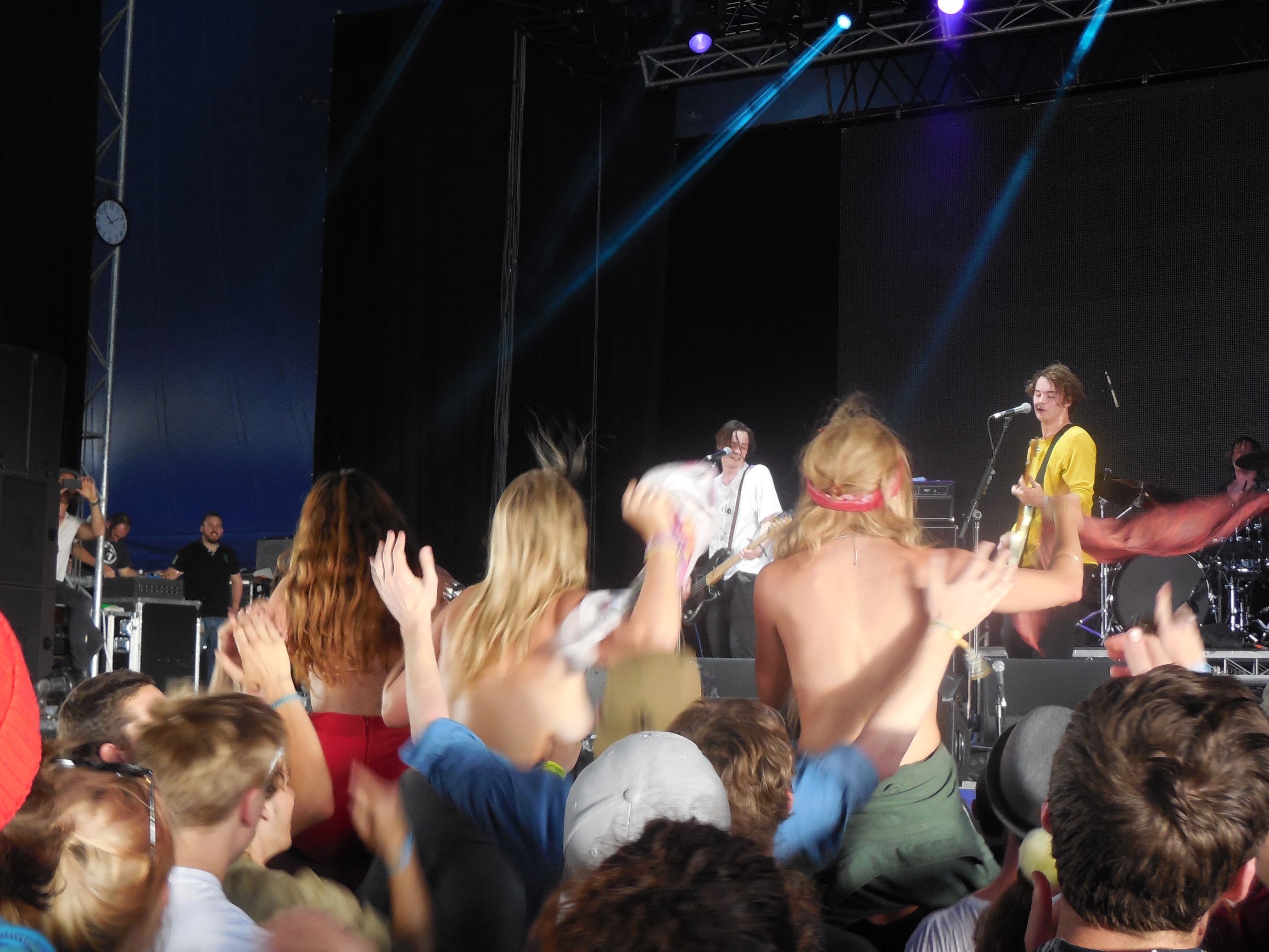 Splendour - Chilli Jesson from Palma Violets crowdsurfingPalma Violets were not a quiet experience, putting on a raucous, enthusiastic rock show. The band were young, with the full gamut of young guy personalities – the awkward nervousness of guitarist Sam Fryer, the bookish intensity of Joseph-Gordon-Levitt-in-3rdRockfromtheSun-looking-motherfucker Peter Mayhew on keyboards (who demonstrated some wonderful, gangly dancing towards the end of the set), or bassist Chilli Jesson, who Jae aptly described as a “right cunt,” with that Johnny Rotten spitting on the crowd sort of vibe. Young men possessing this brand of self-righteous posturing tend to attract a certain kind of attention, as was the case on this sunny afternoon, with three young ladies doffing their shirts and sharing their own assets with the band.