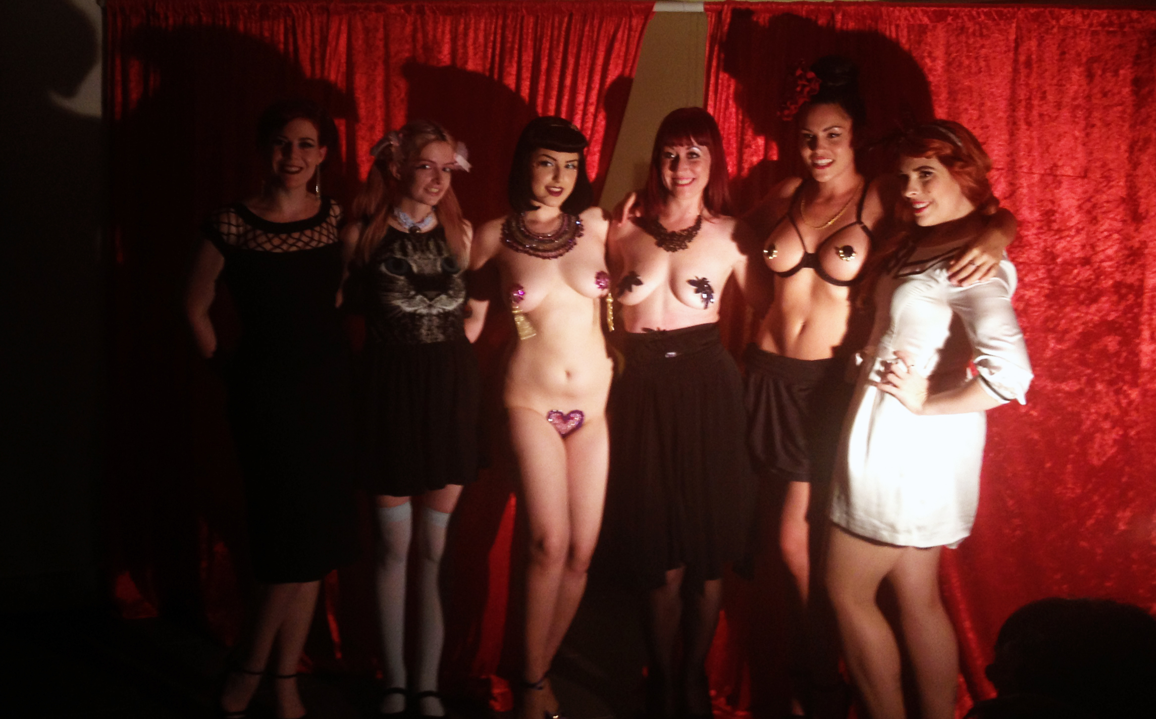 Birdlesque performers, 9/11/2013. (L-R) Night Temptress, Margerite LeDesire, Tina Joy, Melody BonBon, Delle L’Amour, Betty Lovecat