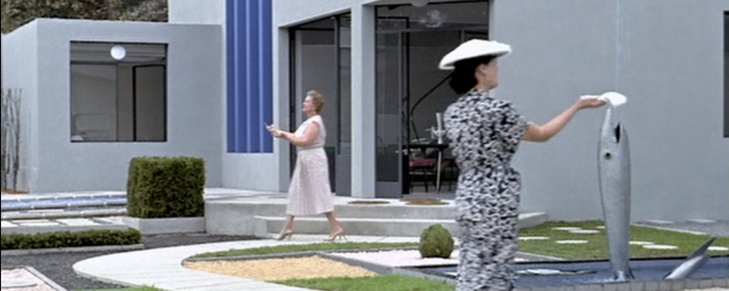 Tati’s compositions don’t direct your eye – you’re encouraged to survey the screen – but this is fitting given his setpieces revolve around things seen and unseen. Many gags are built around things the audiences sees coming but the characters do not (eg walking into poles) or vice versa (Hulot using a window to make a songbird sing). The emphasis on transparency in the innovative set designs is both prescient with respect to the growing role of technology and necessary aesthetically; his observational approach requires a geometry that can both conceal and reveal with equivalent ease. I hasten to emphasise that this isn’t as cool and removed as it might sound – the final scenes of Mon Oncle, spent watching dogs from a distance, are imbued with an inexplicable warmth.