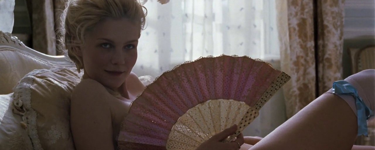 Marie Antoinette’s first challenge, then, is to act as a kind of courtship – or seduction. Just as teenage Marie (Kirsten Dunst) must win over her foppish, childish husband (Jason Schwartzman, expertly channelling an awkward, closeted twelve year-old), so too must Coppola win over her audience. Rather than initially trying to present Marie as a moral figure – a dubious ask – she presents as an oblivious innocent with an edge of eroticism. Again and again Marie is filmed in states of undress or in flimsy, transparent nightgowns; it’s occasionally sexy, yes (it helps that Dunst was God-tier attractive at 24 years old), but it’s also often infantilising, such as when Marie stands naked before of a gaggle of high class ladies waiting for the highest-ranked to clothe her.