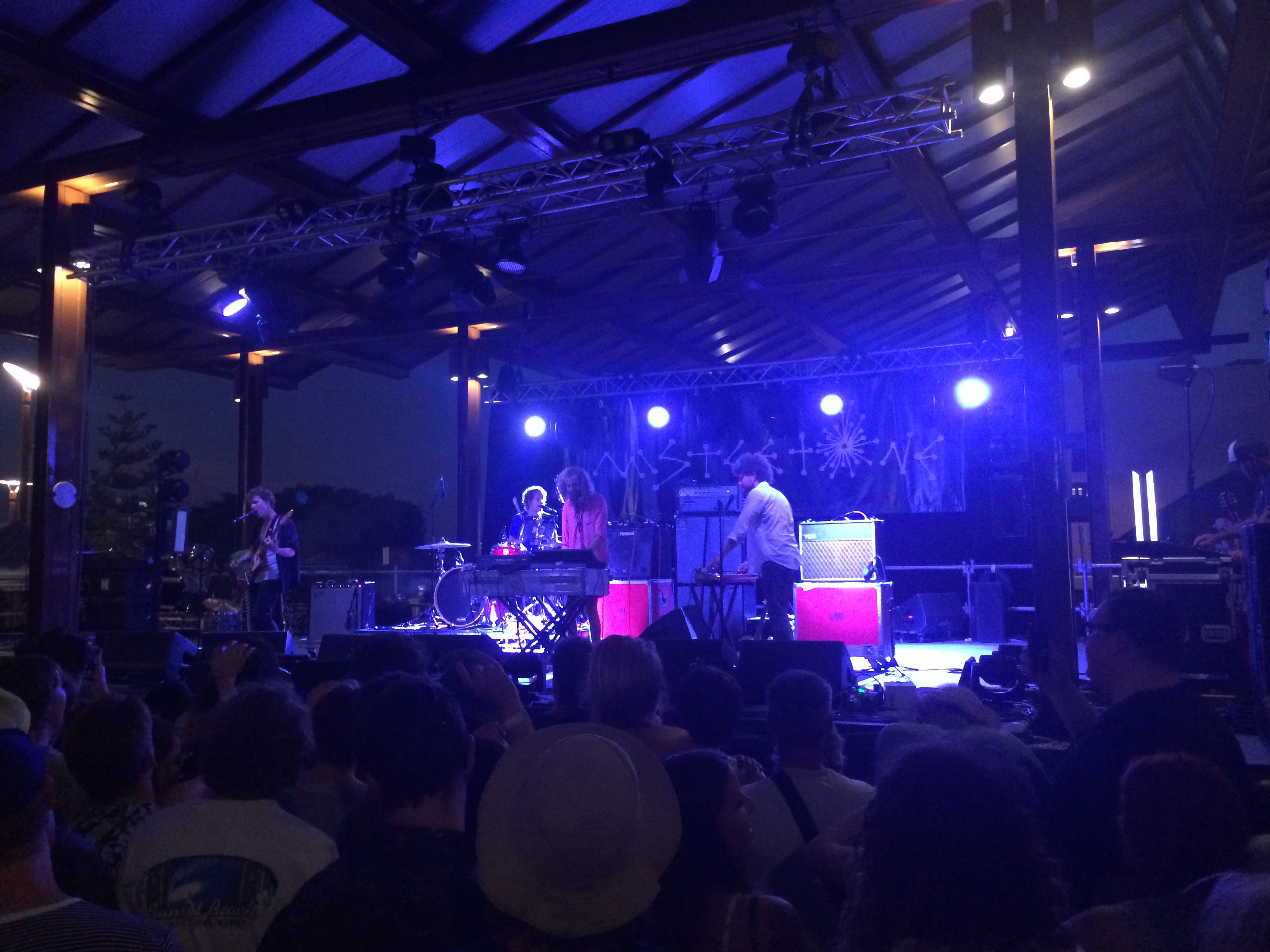 After swinging by to catch the end of Ms Barnett’s show – a rousing rendition of “Avant Gardner” and her new single “Pedestrian at Best” that skewed far closer to rock star than her charming, low-key vibe at Splendour – we made our way towards Pond (yes, at the expense of the inexplicably popular Mac DeMarco). It’s hard to talk about these Perth psych-rockers without mentioning Tame Impala, given they share a bunch of members, so here goes: I like Pond better than Tame Impala. Tame Impala’s EP Innerspeaker perfectly balanced psychedelia and guitar pop but their subsequent work has skewed too close to psych for my tastes; Pond, on the other hand, have an inviting mix of hard(ish) rock and psych that’s right up my alley. Their set – back at the Mistletone stage – was sparsely-attended and accompanied by the orange glow of the sunrise, which seemed entirely apropos.